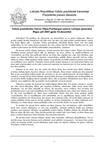 Valsts prezidentes Vairas Vīķes-Freibergas uzruna Latvijas ģimenēm Rīgas pilī 2001.gada 14.decembrī