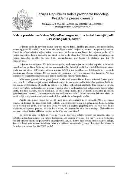 Valsts prezidentes Vairas Vīķes-Freibergas uzruna tautai Jaunajā gadā LTV 2002.gada 1.janvārī