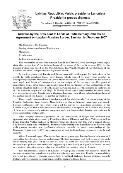 Address by the President of Latvia at Parliamentary Debates on Agreement on Latvian-Russian Border, Saeima, 1st February 2007