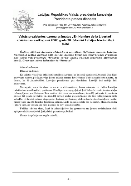 Valsts prezidentes uzruna grāmatas „En Nombre de la Libertad” atvēršanas sarīkojumā 2007. gada 28. februārī Latvijas Nacionālajā teātrī
