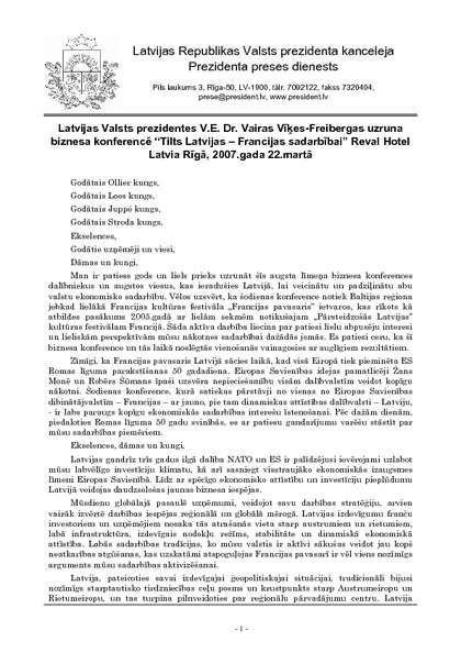 Latvijas Valsts prezidentes V.E. Dr. Vairas Vīķes-Freibergas uzruna biznesa konferencē “Tilts Latvijas – Francijas sadarbībai” Reval Hotel Latvia Rīgā, 2007.gada 22.martā