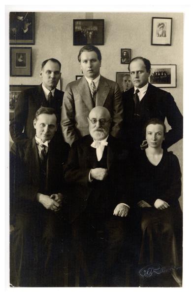 Pirmajā rindā no kreisās puses: Ādolfs Ābele, Jāzeps Vītols, Lija Krasinska; otrajā rindā no kreisās puses: Voldemārs Upenieks, Arvīds Žilinskis, Leonīds Slaucītājs.
