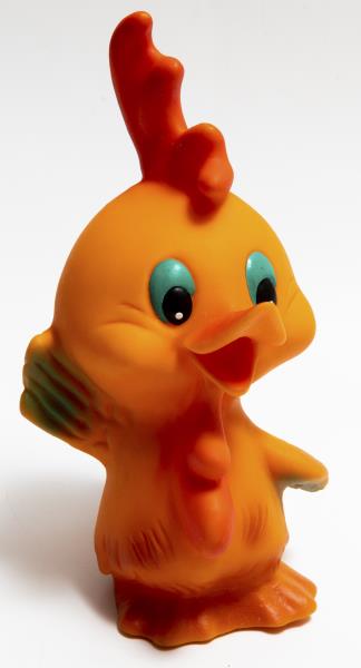 Gumijas rūpnīca "Dobele". Rotaļlieta "Gailis oranžā krāsā ar sarkanu un zaļu iekrāsojumu". 1986.gads