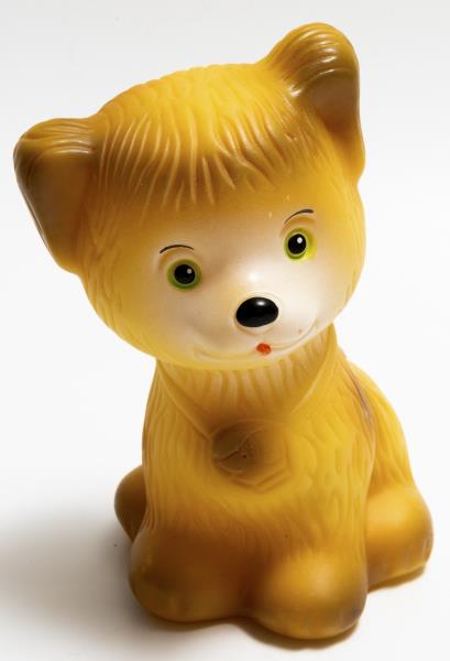 Gumijas rūpnīca "Dobele". Rotaļlieta "Suns - Šariks, dzeltens ar brūnu tonējumu". 1993-1994.gads