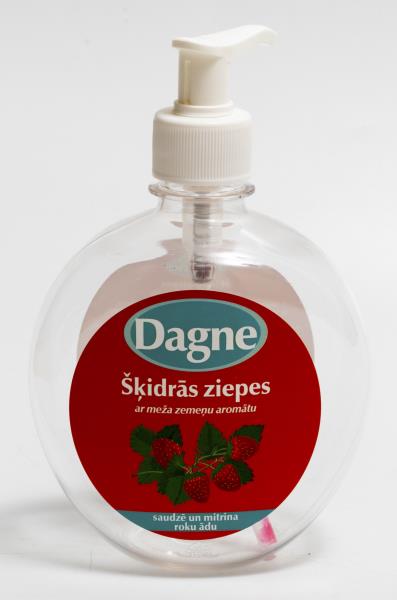 Ķīmiskā rūpnīca "Spodrība". Trauks plastmasas "Dagne - Šķīdrās ziepes, saudzē un mitrina roku ādu ar meža zemeņu aromātu". 2003.gads