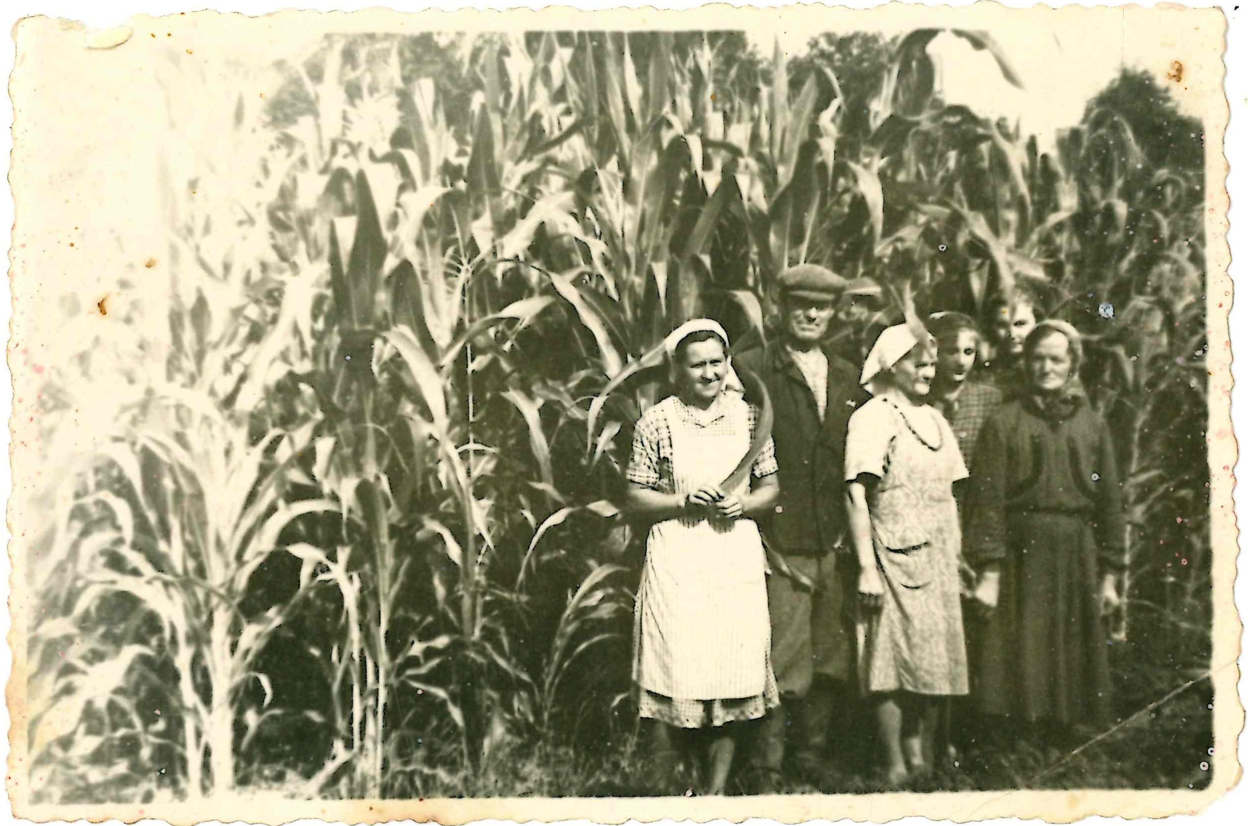 Kolhoza "Druviena" varenā kukurūzas raža 1954. gadā. Priekšplānā no kreisās E. Sudule, (vīrietis nezināms), M. Ceriņa, V. Briede, M. Spirģe (aiz viņas nezināms).