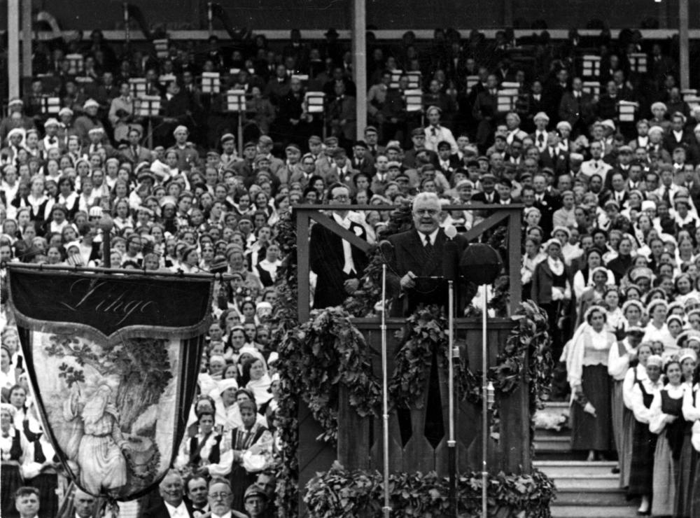 IX Vispārējo latviešu Dziesmu svētku (tolaik - Devītie latvju vispārējie dziesmu svētki) atklāšanas pasākums Uzvaras laukuma (tagad Uzvaras parks) svētku estrādē. No tribīnes klātesošos uzrunā Latvijas Valsts un Ministru prezidents Kārlis Ulmanis.