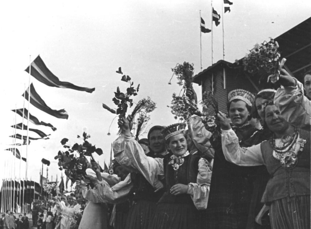 IX Vispārējo latviešu Dziesmu svētku (tolaik - Devītie latvju vispārējie dziesmu svētki) dalībnieki Uzvaras laukuma (tagad Uzvaras parks) svētku estrādē.