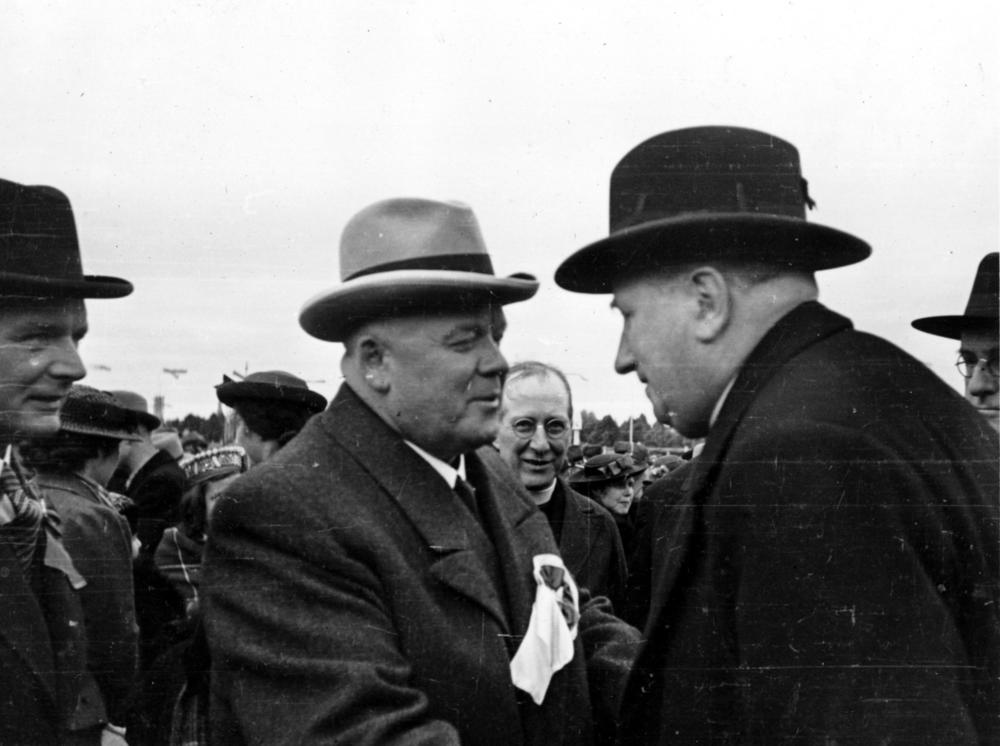 IX Vispārējo latviešu Dziesmu svētku (tolaik - Devītie latvju vispārējie dziesmu svētki) atklāšanas pasākums Uzvaras laukuma (tagad Uzvaras parks) svētku estrādē. Latvijas Valsts un Ministru prezidents Kārlis Ulmanis (vidū) ar svētku organizatoriem.