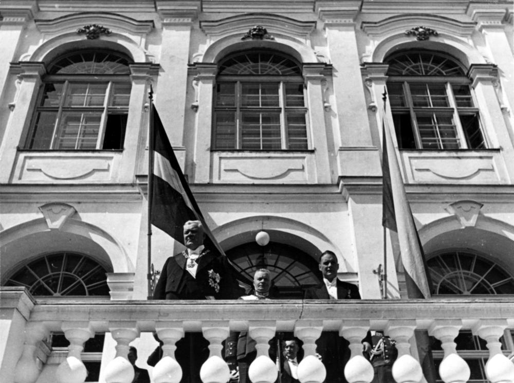Latvijas Valsts un Ministru prezidents Kārlis Ulmanis sagaida ārvalstu sūtņus Viestura piemiņas pilī Jelgavā. No kreisās: 1. Kārlis Ulmanis, 2. Latvijas armijas komandieris ģenerālis Krišjānis Berķis, 3. ārlietu ministrs Vilhelms Munters.