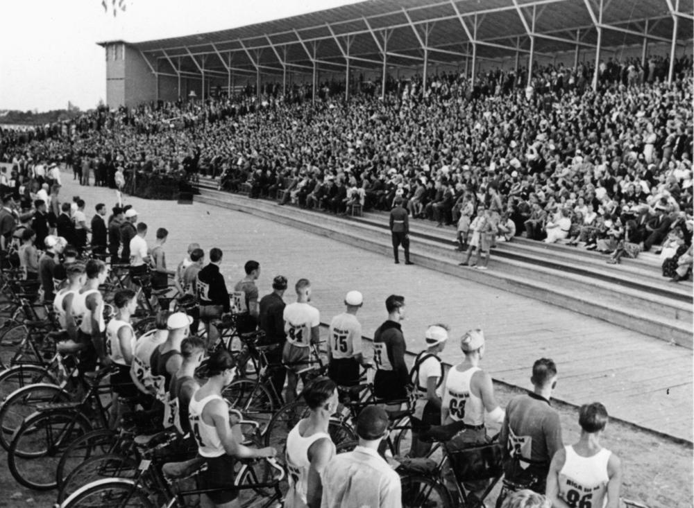 3. Latvijas riteņbraucēju Vienības brauciena noslēguma parāde Uzvaras laukumā (tagad Uzvaras parks). Pretī tribīnēm riteņbraucēji ar velosipēdiem ierindā.