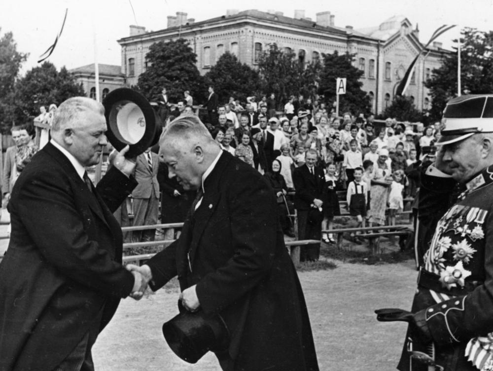 Kara skolas kadetu paaugstināšana virsnieku dienesta pakāpē. Svinīgā parāde Armijas sporta laukumā. No kreisās: 1. Latvijas Valsts un Ministru prezidents Kārlis Ulmanis, 2. kara ministrs ģenerālis Jānis Balodis, 3. Latvijas armijas komandieris ģenerālis Krišjānis Berķis.