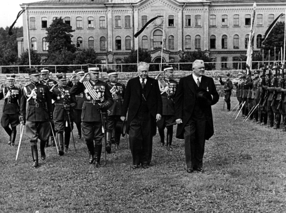 Kara skolas kadetu paaugstināšana virsnieku dienesta pakāpē. Svinīgo parādi Armijas sporta laukumā pieņem Latvijas valdības un armijas augstākās amatpersonas. 1. rindā no labās: 1. Latvijas Valsts un Ministru prezidents Kārlis Ulmanis, 2. kara ministrs ģenerālis Jānis Balodis, 3. Latvijas armijas komandieris ģenerālis Krišjānis Berķis, 4. Kara skolas priekšnieks pulkvedis Arvīds Krīpens. 2. rindā no labās: 1. Latvijas armijas štāba priekšnieks ģenerālis Mārtiņš Hartmanis, 2. Latvijas armijas štāba priekšnieka palīgs ģenerālis Roberts Dambītis, 3. Rīgas apgabala garnizona priekšnieks ģenerālis Fricis Virsaitis.