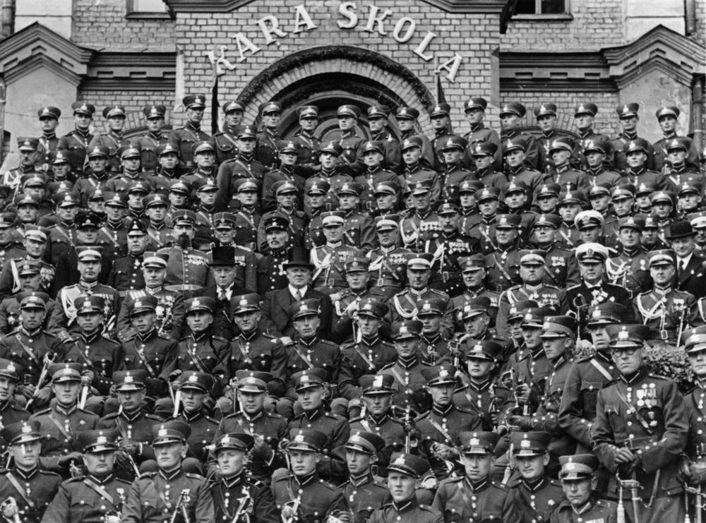 Latvijas valdības un armijas amatpersonas jauno virsnieku vidū. Centrā Latvijas Valsts un Ministru prezidents Kārlis Ulmanis. No Kārļa Ulmaņa pa kreisi: 1. kara ministrs ģenerālis Jānis Balodis, 2. Latvijas armijas komandieris ģenerālis Krišjānis Berķis, 3. Latvijas armijas štāba priekšnieks ģenerālis Mārtiņš Hartmanis, 4. Rīgas apgabala garnizona priekšnieks ģenerālis Fricis Virsaitis. No Kārļa Ulmaņa pa labi: 1. Kara skolas priekšnieks pulkvedis Arvīds Krīpens, 2. Augstākās kara skolas priekšnieks ģenerālis Hugo Rozenšteins, 3. tehniskās divīzijas komandieris ģenerālis Jānis Kurelis, 4. Latvijas armijas štāba priekšnieka palīgs ģenerālis Roberts Dambītis, 5. Jūras krastu aizsardzības eskadras komandieris kapteinis Teodors Spāde, 6. Latvijas armijas štāba operatīvās daļas priekšnieks pulkvedis Otto Ūdentiņš.