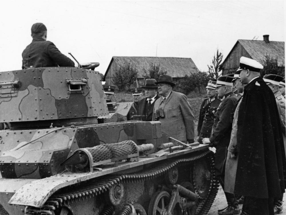 Latvijas valdības un armijas amatpersonas aplūko tanku Latvijas armijas rudens manevru laikā Vecmuižas apkārtnē (tagad Vecumnieki Bauskas novadā). 1. rindā no kreisās: 1. kara ministrs ģenerālis Jānis Balodis, 2. Latvijas Valsts un Ministru prezidents Kārlis Ulmanis, 4. Latvijas armijas komandieris ģenerālis Krišjānis Berķis, 5. Jūras krastu aizsardzības eskadras komandieris kapteinis Teodors Spāde.