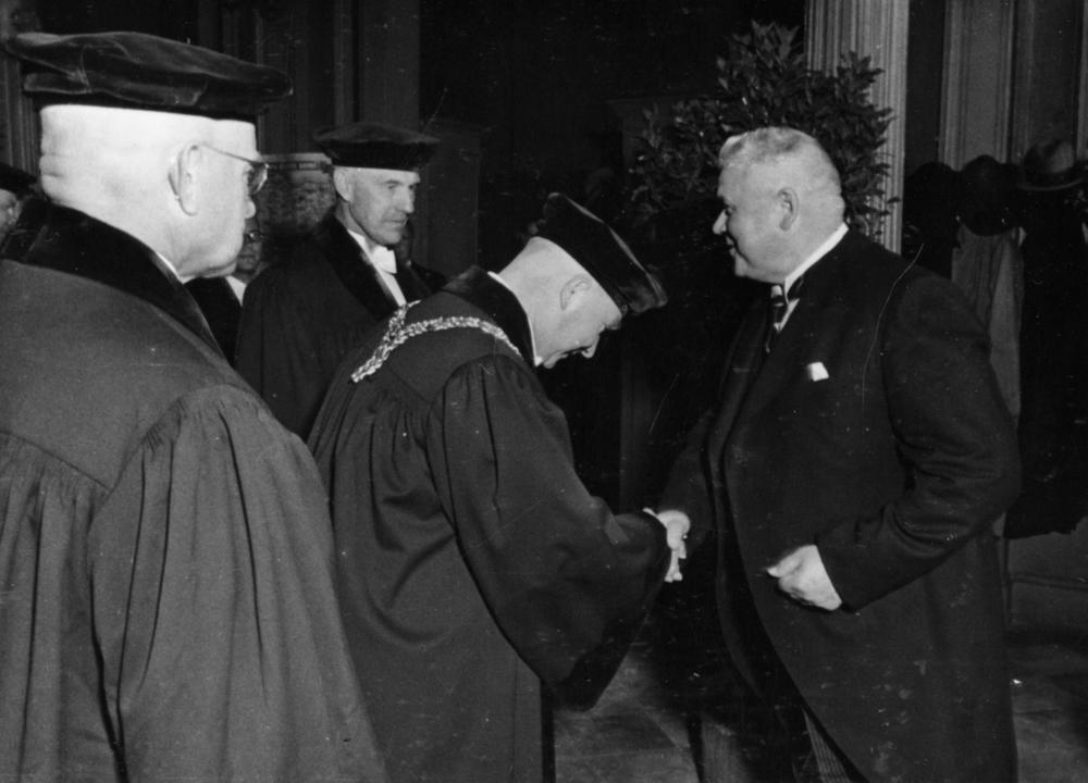 Latvijas Universitātes 19 gadu pastāvēšanas jubilejas svinības. Latvijas Valsts un Ministru prezidenta Kārļa Ulmaņa sagaidīšana. No labās: 1. Kārlis Ulmanis, 2. Latvijas Universitātes rektors, profesors Mārtiņš Prīmanis, 3. Latvijas Universitātes prorektors, profesors Alfrēds Vītols, 4. Latvijas Universitātes prorektors, profesors Jānis Kārkliņš.