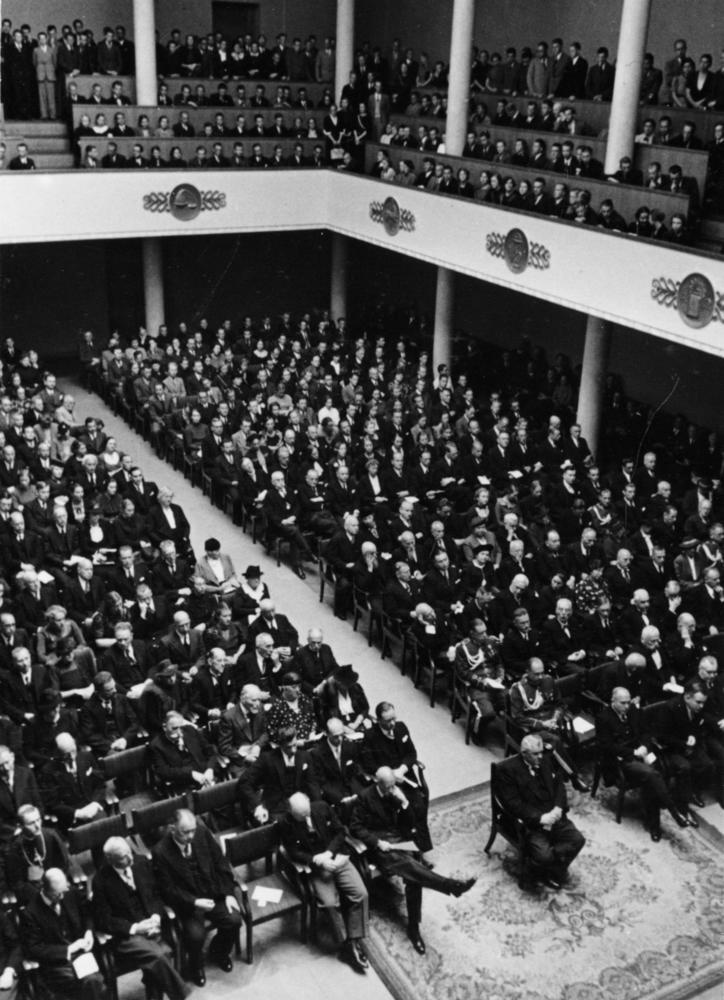 Latvijas Universitātes pastāvēšanas 19 gadu jubilejas svinības LU Lielajā Aulā. Centrā Latvijas Valsts un Ministru prezidents Kārlis Ulmanis.