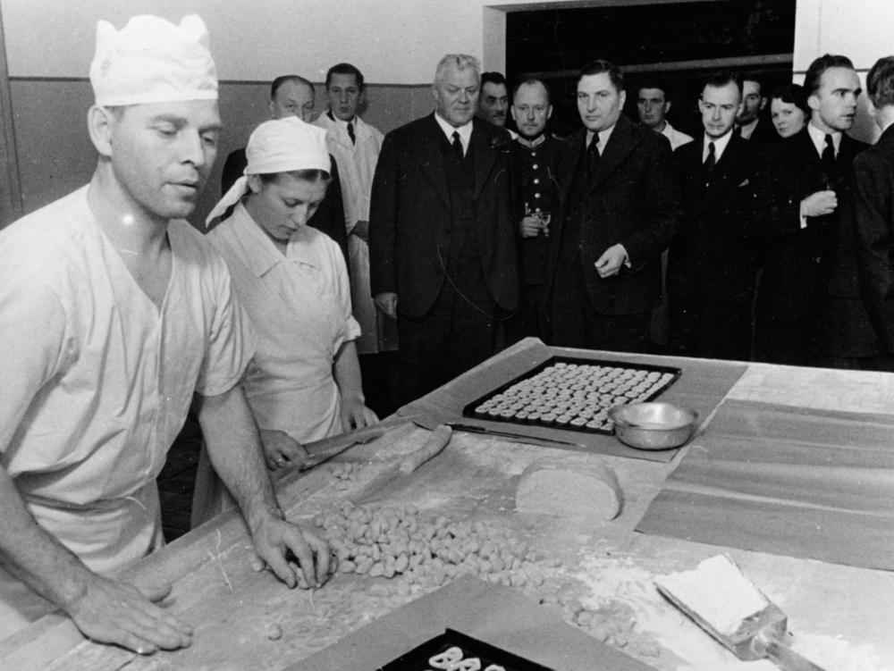 Latvijas Valsts un Ministru prezidents Kārlis Ulmanis (centrā) vēro tējas cepumu izgatavošanu, iepazīstoties ar darba apstākļiem akciju sabiedrības "Maiznieks" maizes ceptuvē. No Kārļa Ulmaņa pa labi: 1. Latvijas Valsts un Ministru prezidenta adjutants un akciju sabiedrības "Maiznieks" valdes loceklis pulkvedis Miervaldis Lūkins, 2. akciju sabiedrības "Maiznieks" direktors Ernests Rozentāls.