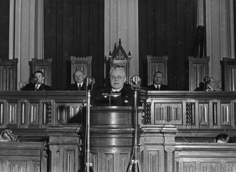 Latvijas Valsts un Ministru prezidents Kārlis Ulmanis uzrunā pirmās saimniecisko kameru kopsapulces dalībniekus Kongresu nama (Lielās Ģildes) sapulču zālē. Prezidijā no kreisās: 1. Latvijas Amatniecības kameras priekšsēdētājs Jānis Lukševics, 2. Latvijas Lauksaimniecības kameras priekšsēdētājs Rūdolfs Dzērve, 3. Latvijas Darba kameras priekšsēdētājs Kārlis Egle, 4. Latvijas Rakstu un mākslas kameras priekšsēdētājs Jūlijs Druva.