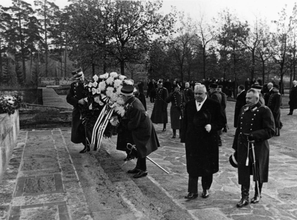 11. novembra - Latvijas armijas, Lāčplēša Kara ordeņa kavalieru un kara invalīdu dienas svinības. Latvijas Valsts un Ministru prezidents Kārlis Ulmanis un Latvijas armijas komandieris, ģenerālis Krišjānis Berķis noliek piemiņas vainagus Brāļu kapos. No labās: 1. Krišjānis Berķis, 2. Kārlis Ulmanis.