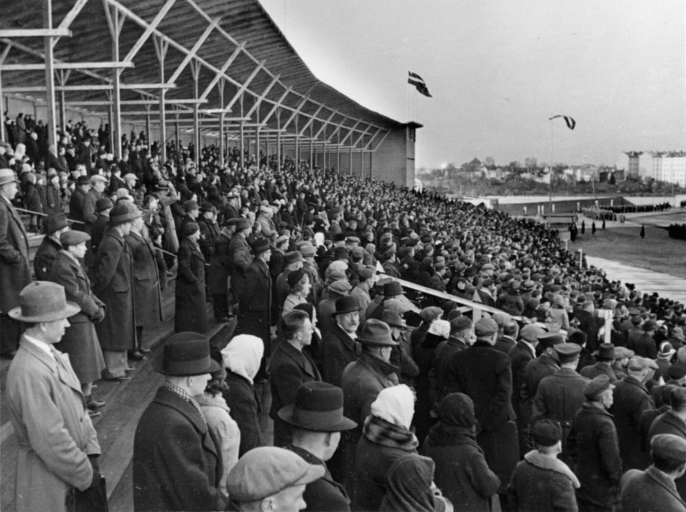 11. novembra - Latvijas armijas, Lāčplēša Kara ordeņa kavalieru un kara invalīdu dienas svinības. Armijas parādes skatītāji tribīnēs Uzvaras laukumā.