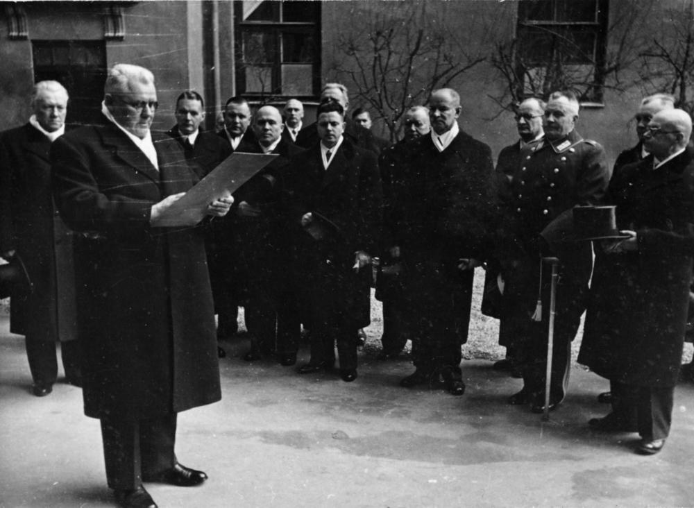 Latvijas Valsts un Ministru prezidents Kārlis Ulmanis (priekšplānā) Rīgas pils pagalmā uzrunā svinīgā akta dalībniekus pirms piemiņas plāksnes iemūrēšanas Triju zvaigžņu torņa pamatos. Aiz Kārļa Ulmaņa no kreisās: 1. kara ministrs ģenerālis Jānis Balodis, 2. ārlietu ministrs Vilhelms Munters, 4. tieslietu ministrs Hermanis Apsītis, 6. finansu ministrs Alfrēds Valdmanis, 7. Valsts kontrolieris Jānis Kaminskis, 8. izglītības ministrs profesors Jūlijs Auškāps, 9. Rīgas pilsētas galva Roberts Liepiņš, 10. Latvijas armijas komandieris ģenerālis Krišjānis Berķis, 11. Valsts kancelejas direktors, ministrs Dāvids Rudzītis.