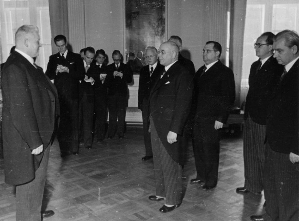 Latvijas Republikas proklamēšanas 20. gadadienas svinībām veltītā pieņemšana Rīgas pilī. Latvijas Valsts un Ministru prezidentu Kārli Ulmani (no kreisās) sveic Rakstu un mākslas kameras apvienoto biedrību pārstāvju delegācija kameras priekšsēdētāja Jūlija Druvas vadībā. Aiz Jūlija Druvas no kreisās: 1. izdevējs Jānis Rapa, 2. rakstnieks Aleksandrs Grīns, 3. komponists Jānis Kalniņš, 4. jurists, rakstnieks un vēsturnieks Arveds Švābe.