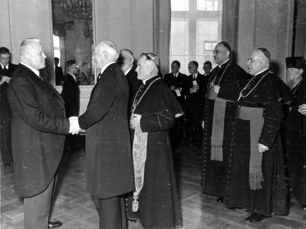 Latvijas Republikas proklamēšanas 20. gadadienas svinībām veltītā pieņemšana Rīgas pilī. Latvijas Valsts un Ministru prezidentu Kārli Ulmani sveic baznīcas galvas. No kreisās: 1. Kārlis Ulmanis, 2. Latvijas evaņģēliski luteriskās baznīcas arhibīskaps Teodors Grīnbergs, 4. Romas katoļu baznīcas Rīgas metropolijas arhibīskaps metropolīts Antonijas Springovičs, 6. Latvijas pareizticīgo baznīcas Rīgas un visas Latvijas metropolīts Augustīns Pētersons.