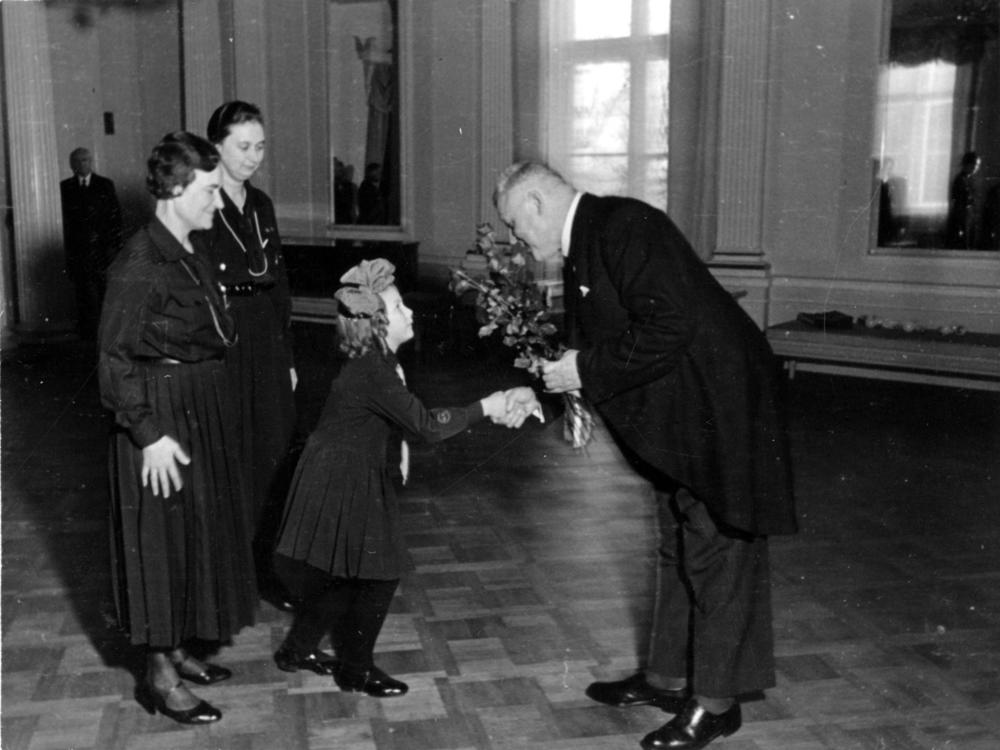 Latvijas Valsts prezidentu, Latvijas Republikas Ministru prezidentu Kārli Ulmani Rīgas pilī sveic gaidu organizācijas jaunākā pārstāve "Guntiņa", Astrīde Freimane, par godu Latvijas Republikas proklamēšanas 20. gadadienas svinībām.