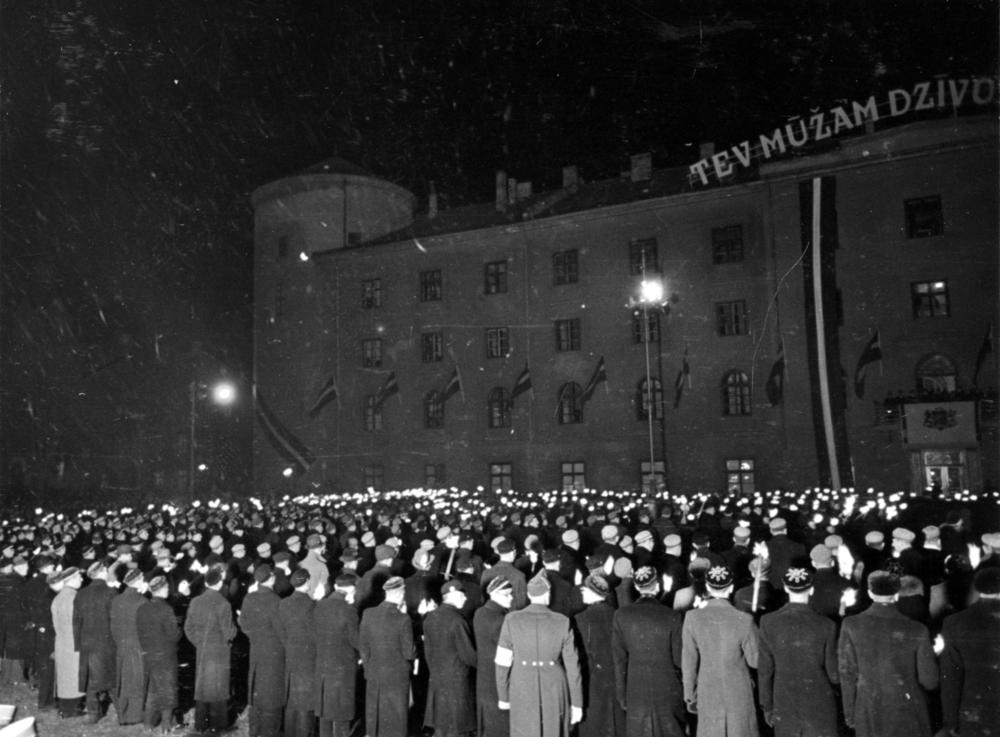 Studentu lāpu gājiens pie Rīgas pils par godu Latvijas Republikas proklamēšanas 20. gadadienas svinībām.