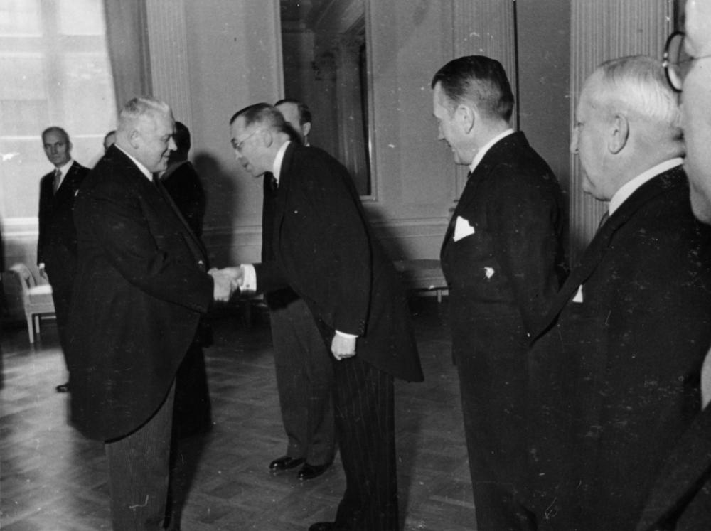 Latvijas Valsts prezidentu, Latvijas Republikas Ministru prezidentu Kārli Ulmani Latvijas Republikas proklamēšanās 20. gadadienas svinībās Rīgas pilī sveic diplomātiskais korpuss.