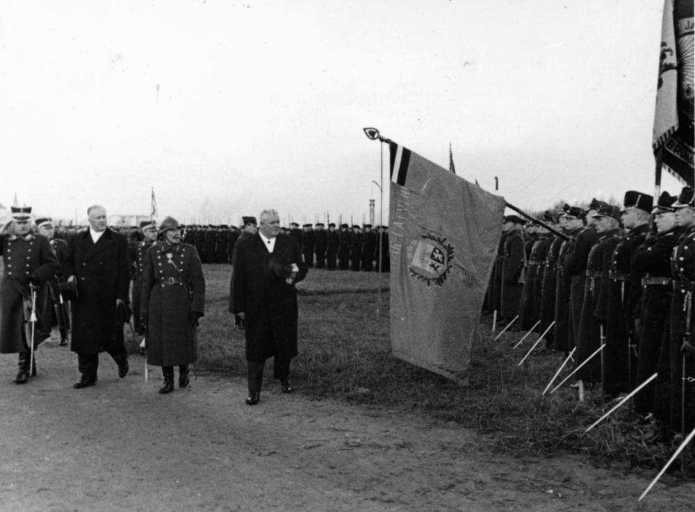 Latvijas armijas parāde par godu Latvijas Republikas proklamēšanas 20. gadadienai veltītajiem svētkiem Uzvaras laukumā (tagad Uzvaras parks). No kreisās: 1. Latvijas armijas komandieris, ģenerālis Krišjānis Berķis, 2. Latvijas Republikas Kara Ministrs, ģenerālis Jānis Balodis, 3. Rīgas apgabala garnizona priekšnieks, ģenerālis Fricis Virsaitis, 4. Latvijas Valsts prezidents, Latvijas Republikas prezidents Kārlis Ulmanis.
