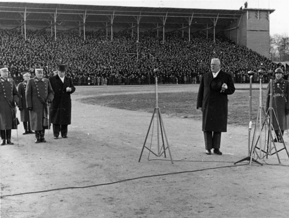 Latvijas Valsts prezidents, Latvijas Republikas Ministru prezidents Kārlis Ulmanis, uzrunājot Latvijas armijas parādes dalībniekus un apmeklētājus Uzvaras laukumā (tagad Uzvaras parkā), par godu Latvijas Republikas proklamēšanas 20. gadadienas svinībām. Latvijas valdības pārstāvji no kreisās: 1. Latvijas armijas štāba priekšnieks, ģenerālis Mārtiņš Hartmanis, 2. Latvijas armijas komandieris, ģenerālis Krišjānis Berķis, 3. Latvijas Republikas Kara ministrs Jānis Balodis, 4. Latvijas Valsts prezidents, Latvijas Republikas Ministru prezidents Kārlis Ulmanis.