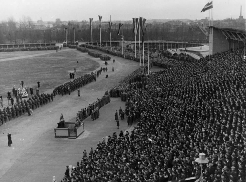 Latvijas armijas parāde par godu Latvijas Republikas proklamēšanas 20. gadadienai veltītajiem svētkiem Uzvaras laukumā (tagad Uzvaras parks).