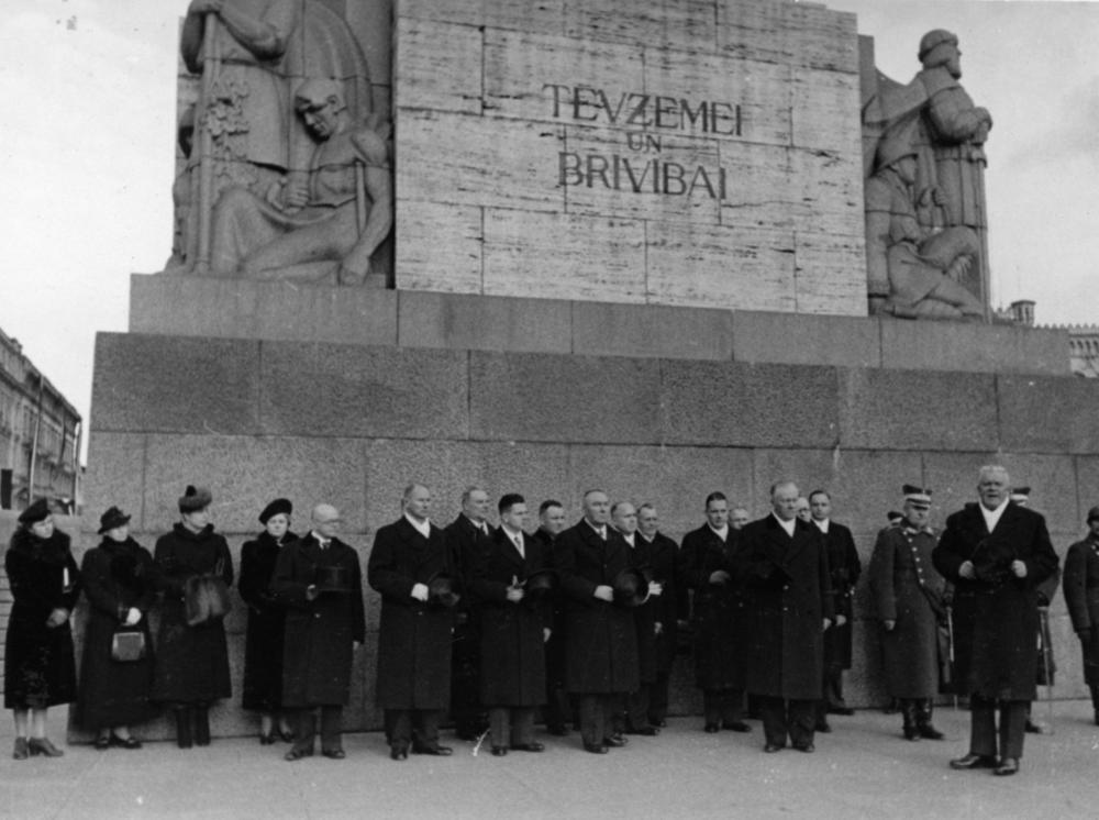 Latvijas Valsts prezidents, Latvijas Republikas Ministru prezidents Kārlis Ulmanis, uzrunājot Latvijas Republikas proklamēšanas 20. gadadienas svinību apmeklētājus, pie Brīvības pieminekļa. Latvijas valdības pārstāvji, no kreisās: 7. Latvijas Republikas Izglītības ministra biedrs Jāzeps Čamanis, 10. bijušais Latvijas Valsts prezidents Alberts Kviesis, 11. Latvijas Republikas Tieslietu ministrs Hermanis Apsītis, 13. Latvijas Republikas Ārlietu ministrs Vilhelms Munters, 14. Latvijas Republikas Kara ministrs, ģenerālis Jānis Balodis, 16. Latvijas Republikas armijas komandieris, ģenerālis Krišjānis Berķis, 17. Latvijas Valsts prezidents, Latvijas Republikas Ministru prezidents Kārlis Ulmanis.