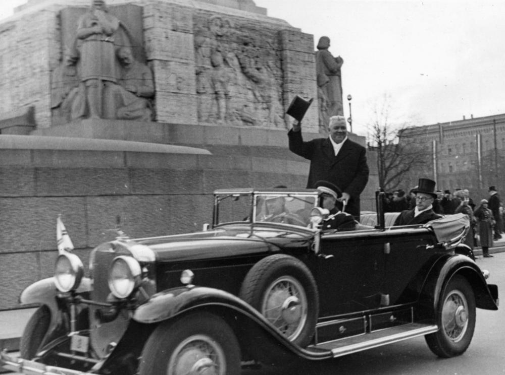 Latvijas Valsts un Ministru prezidents Kārlis Ulmanis ar paceltu cilindru sveicina Latvijas Republikas proklamēšanas 20. gadadienas svinību apmeklētājus, stāvot automašīnā pie Brīvības pieminekļa. Sēž prezidenta sekretārs Jānis Cimermanis (no 1940. gada Jānis Rudums).