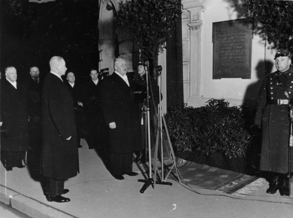 Latvijas Valsts prezidents, Latvijas Republikas Ministru prezidents Kārlis Ulmanis, atklājot Latvijas Republikas proklamēšanas akta piemiņas plāksni pie Latvijas Nacionālā teātra par godu Latvijas Republikas proklamēšanas 20. gadadienas svinībām. No kreisās: 1. Rīgas pilsētas galva Roberts Liepiņš.