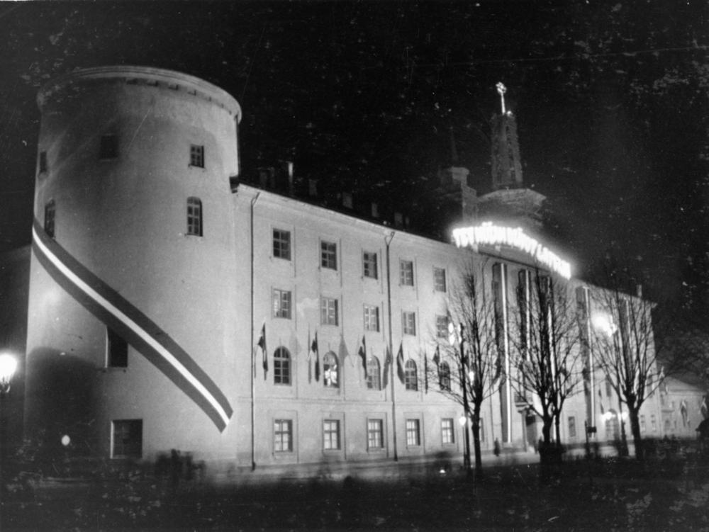 Izdekorētā Rīgas pils ēka Latvijas Republikas proklamēšanas 20. gadadienas svinībām.