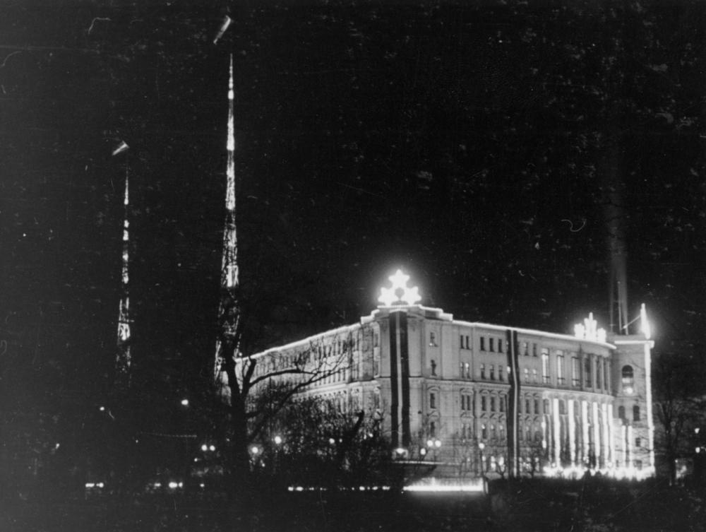 Par godu Latvijas Republikas proklamēšanas 20. gadadienas svinībām izgaismotā Latvijas Pasta un telegrāfa departamenta galvenā ēka Aspazijas bulvārī 15 (pēc tagadējās numerācijas 5) un Latvijas Radiofona Rīgas raidītāja antenas torņi kanālmalā.