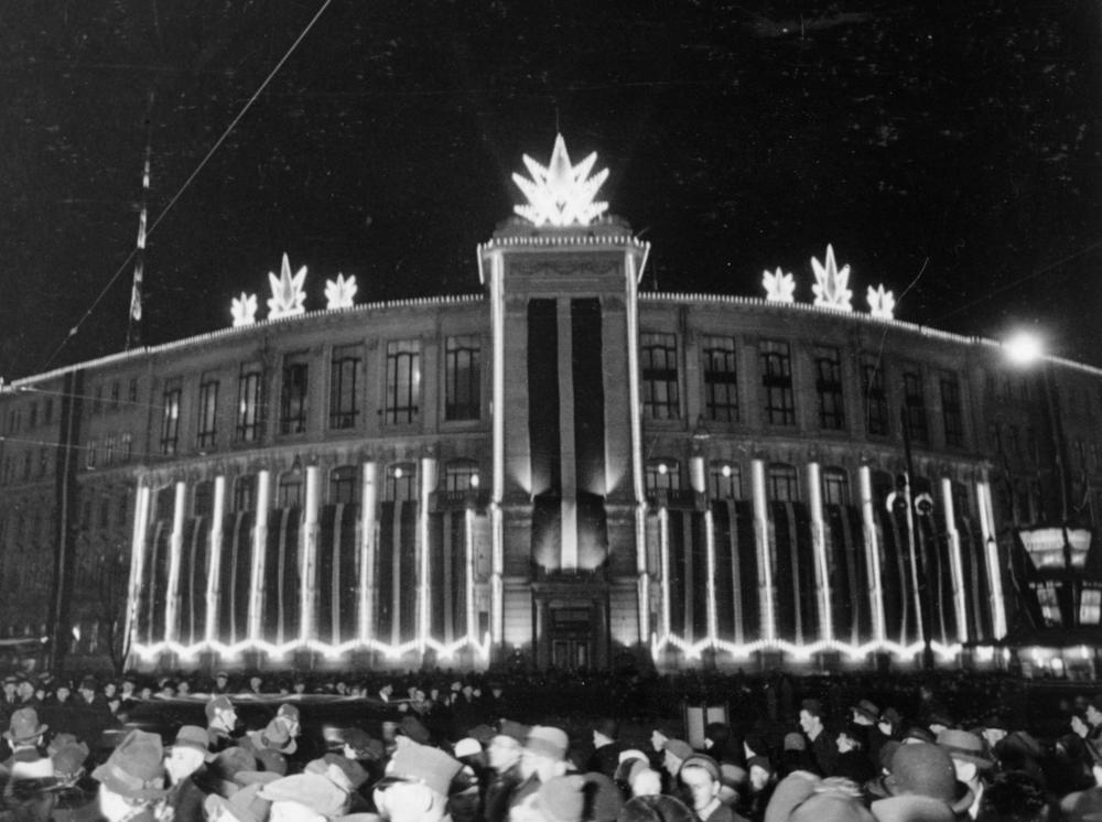 Par godu Latvijas Republikas proklamēšanas 20. gadadienas svinībām izgaismotā un Latvijas valsts karogiem izrotātā Latvijas Pasta un telegrāfa departamenta galvenā ēka Aspazijas bulvārī 15 (pēc tagadējās numerācijas 5), kur darbojās arī Latvijas Radiofons. Priekšplānā svētku apmeklētāju pūlis.