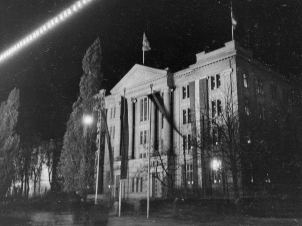 Izdekorētā un izgaismotā Latvijas Republikas Ārlietu ministrijas ēka, par godu godu Latvijas Republikas proklamēšanas 20. gadadienas svinībām.