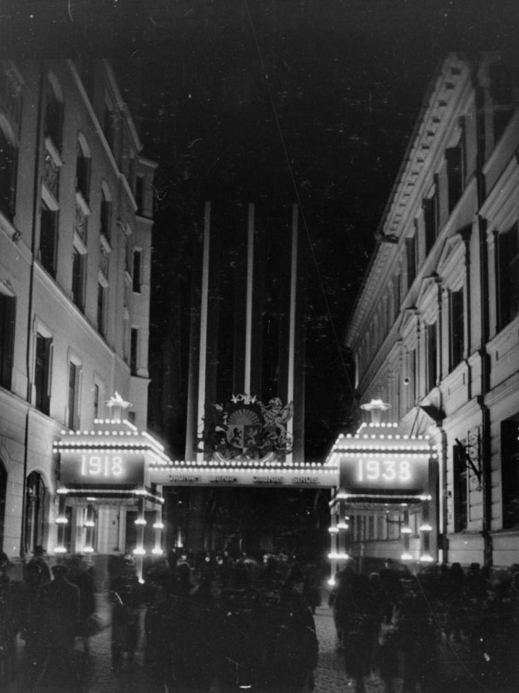 Izdekorētā un iluminētā Pils iela par godu Latvijas Republikas proklamēšanas 20. gadadienas svinībām. Pa labi atrodas Latvijas Republikas Finanšu ministrijas Tiešo nodokļu departamenta ēka Pils ielā 12.