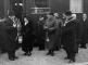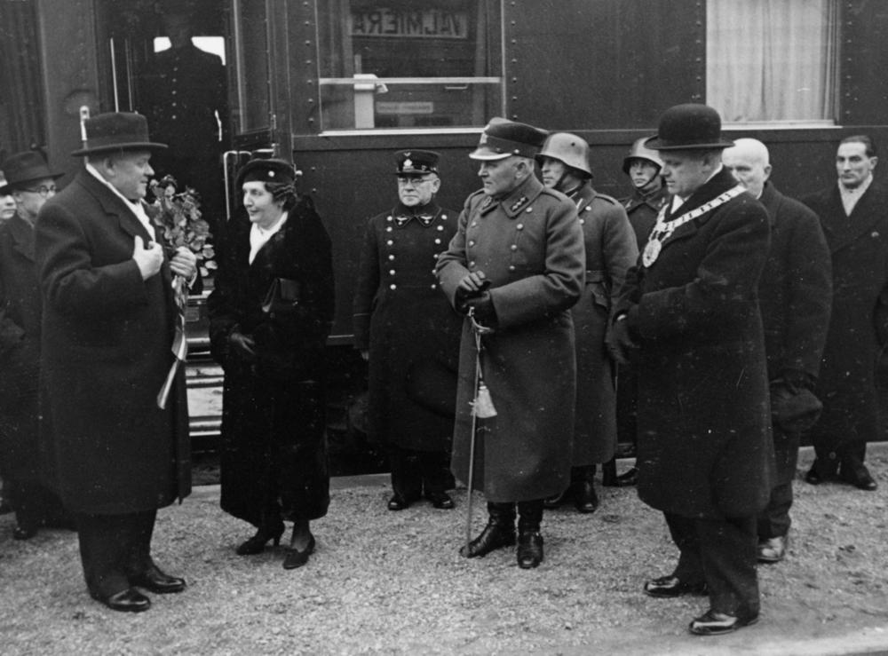 Latvijas Valsts un Ministru prezidents Kārlis Ulmanis pie vilciena, ierodoties Valmierā, lai piedalītos Baltijas lauksaimnieku biedrības 40 gadu darbības svinībās. No kreisās: 1. Kārlis Ulmanis, 5. 8. Daugavpils kājnieku pulka Valmieras garnizona priekšnieks pulkvežleitnants Jūlijs Kristaps Jaunsniķeris, 6. Valmieras pilsētas galva Jānis Ruģēns.