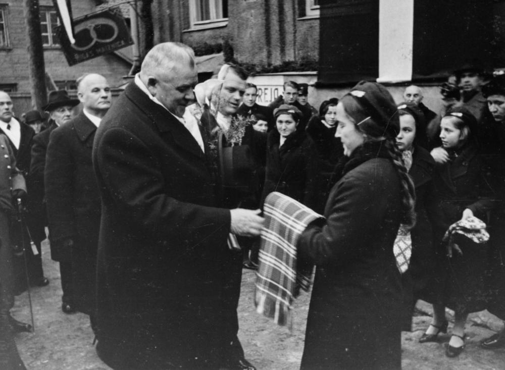 Latvijas Valsts un Ministru prezidenta Kārļa Ulmaņa (no kreisās) sagaidīšana Valmierā, ierodoties uz Baltijas lauksaimnieku biedrības 40 gadu darbības svinībām.