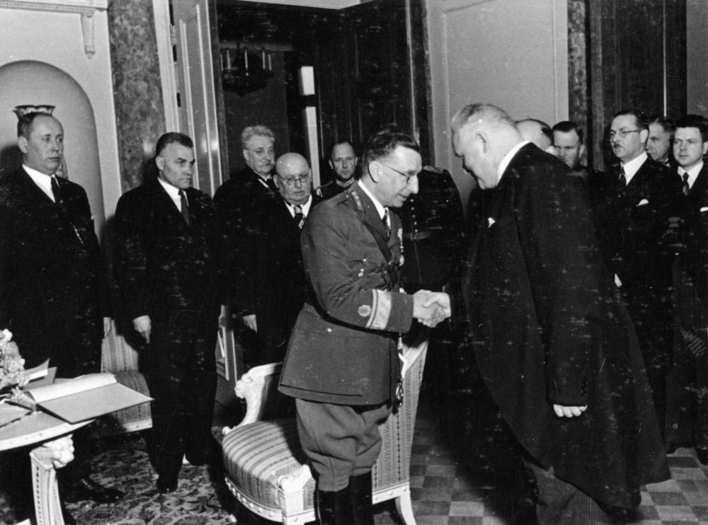 Latvijas Tiesu pils atklāšana. Latvijas Valsts un Ministru prezidents Kārlis Ulmanis tieslietu ministra kabinetā sasveicinās ar Tiesu pils atklāšanas viesiem no Igaunijas un Lietuvas. Priekšplānā no kreisās: 1. Igaunijas Augstākās tiesas priekšsēdētājs Kārels Partss (Kaarel Parts), 2. Kārlis Ulmanis.