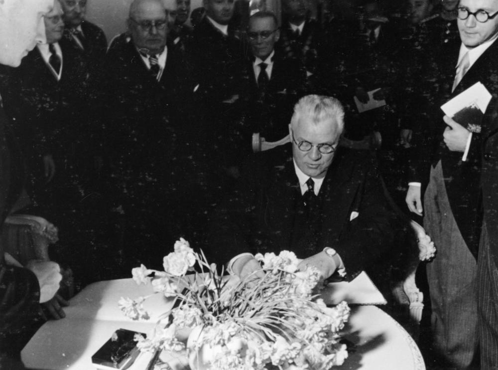 Latvijas Tiesu pils atklāšana. Latvijas Valsts un Ministru prezidents Kārlis Ulmanis tieslietu ministra darba kabinetā parakstās viesu grāmatā.