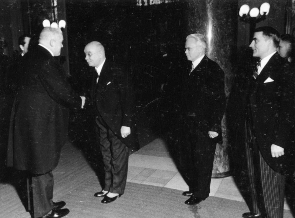 Latvijas Valsts un Ministru prezidents Kārlis Ulmanis Rīgas Latviešu biedrības nama vestibilā sasveicinās ar Latvijas Rakstu un mākslas kameras prezidiju. No kreisās: 1. Kārlis Ulmanis, 2. Latvijas Rakstu un mākslas kameras priekšsēdētājs Jūlijs Druva, 3. Latvijas Rakstu un mākslas kameras priekšsēdētāja vietnieks Jānis Rapa, 4. Latvijas Rakstu un mākslas kameras vicepriekšsēdētājs Mārtiņš Jansons.