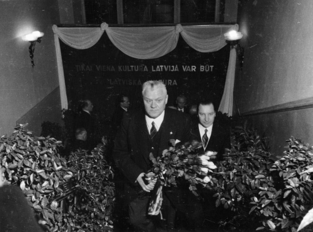 Latvijas Rakstu un mākslas kameras atklāšanas svinības Rīgas Latviešu biedrības namā. No kreisās: 1. Latvijas Valsts un Ministru prezidents Kārlis Ulmanis, 2. sabiedrisko lietu ministrs Alfrēds Bērziņš.