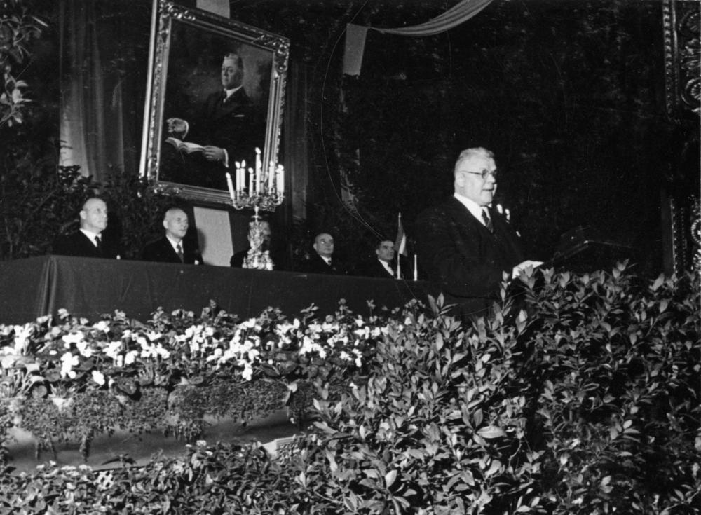 Latvijas Valsts un Ministru prezidents Kārlis Ulmanis uzrunā Latvijas Rakstu un mākslas kameras atklāšanas svinību dalībniekus Rīgas Latviešu biedrības nama Lielajā zālē. Sēž no kreisās Latvijas Rakstu un mākslas kameras prezidija locekļi: 1. vicepriekšsēdētājs Ādolfs Kaktiņš, 2. vicepriekšsēdētājs Jānis Zālītis, 3. priekšsēdētāja vietnieks Jānis Rapa, 4. priekšsēdētājs Jūlijs Druva, 5. vicepriekšsēdētājs Mārtiņš Jansons.