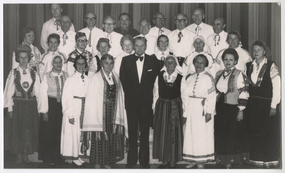 Grupas foto. Brisbenas jauktais koris. Diriģents Ēriks Ozoliņš (centrā). Austrālijas latviešu 31. Kultūras dienas. Brisbena 1981.g. 26. - 31. decembris. Foto: nezināms. Att. otrā pusē piezīmes rokr. ar tinti, latv. un angļu val.